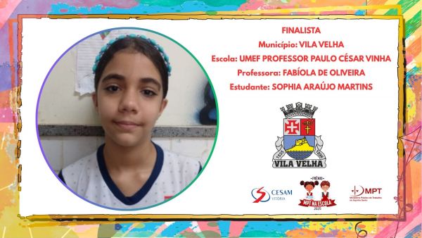 “Desde que a poesia da Sofia chegou para nossa avaliação, vi que tínhamos grande chance de ganhar. É um prazer enorme tê-la representando o nosso estado e, principalmente, o nosso município de Vila Velha. Estamos muito felizes e que venha aí um grande resultado”, afirma a coordenadora do projeto em Vila Velha, Juliana Castro Coutinho Bertollo.