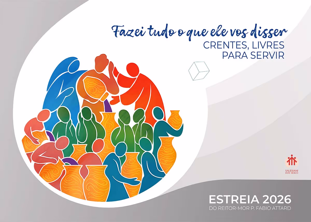 O cartaz da STRENNA 2026, com o tema «FAÇA O QUE ELE LHE DIZER, Fiéis, livres para servir», retrata visualmente a passagem do EVANGELHO sobre as Bodas de Caná. Seguindo a estrutura em quatro partes proposta pelo Reitor-Mor, a ilustração destaca: Maria (à esquerda) olha e percebe a necessidade; ela volta essa consciência para Dom Bosco (ao centro), representando o discernimento cheio de fé e a ação compassiva da missão salesiana, e juntos eles olham para Jesus (com a auréola), que aponta o caminho; o primeiro plano mostra os servos — ouvindo, escolhendo e, finalmente, partilhando o vinho transformado das jarras — para que a comunidade receba a abundância de Deus.